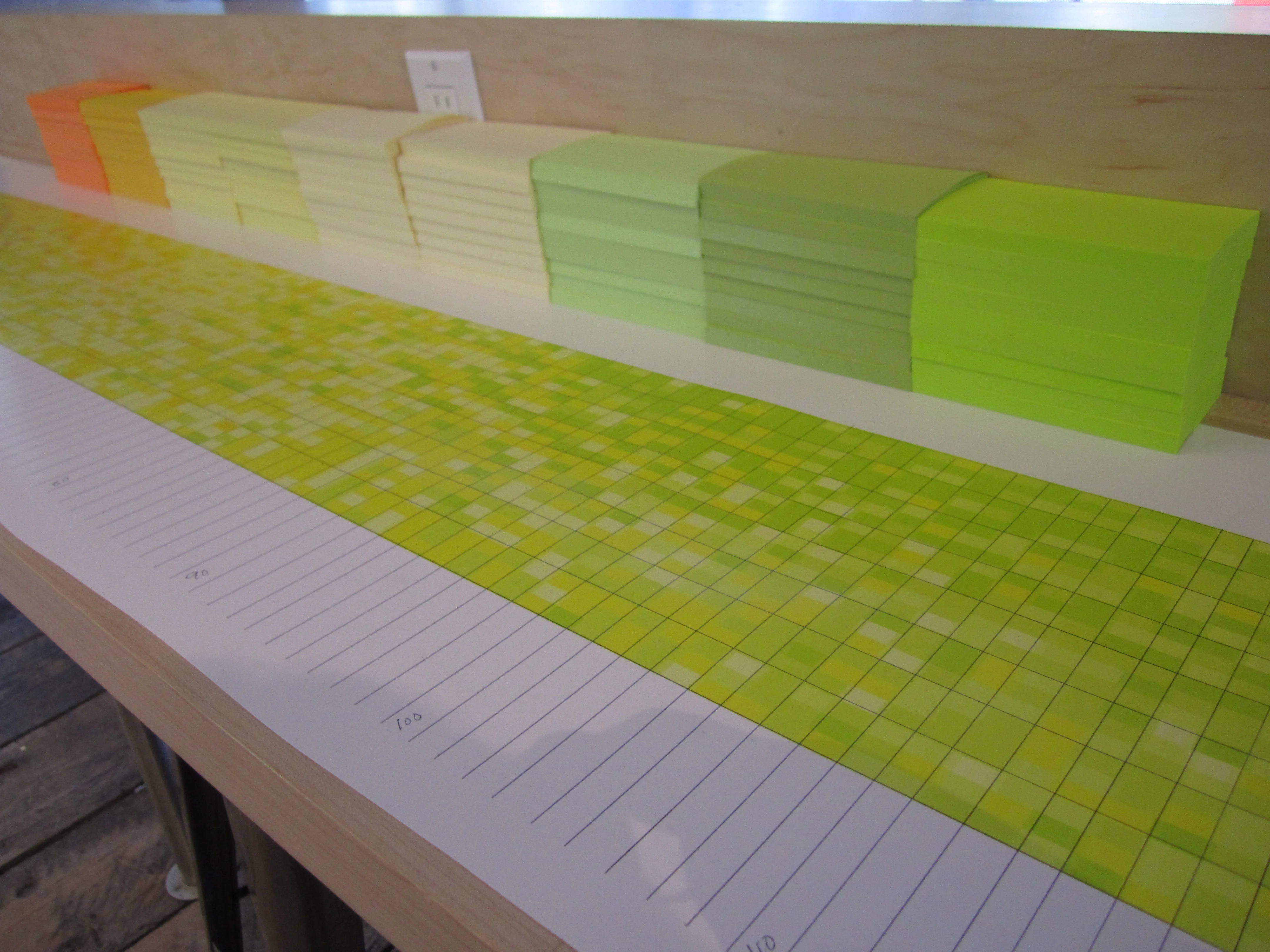 The mural's design was inspired by the idea that lasting change does not occur in one big sweep, rather it happens through a series of several tiny acts building on each other. Standing near the post-it wall, your field of vision will only see one or two colors at a time, it is only in stepping back can you detect the transformation.